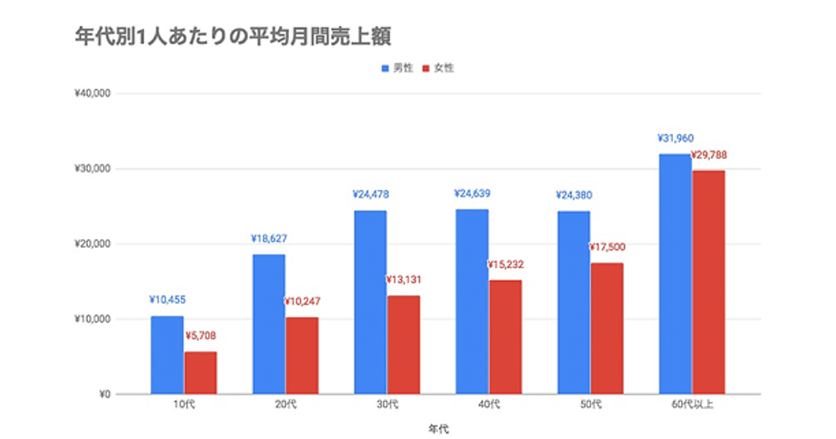 平均月間売上高は17,348円。全年代で男性が女性より高い