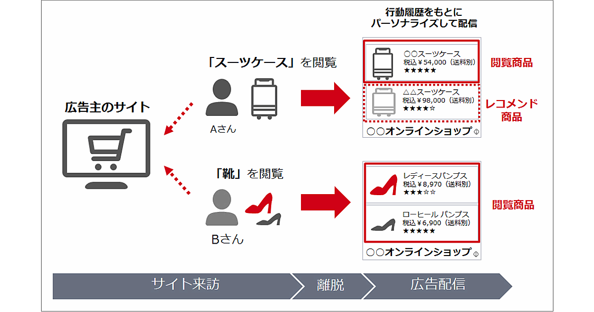 複数種類の商品を扱う事業者は商品ごとに制作物を用意する手間がなく、ユーザーの好みや興味・関心にマッチした商品の広告配信が可能になる。「Yahoo! JAPAN」のトップや各サービスページに配信する。試験提供では、クリック率、コンバージョン(最終成果)率が通常のYDNのリターゲティング広告と比較して2~5倍と大幅に伸びた