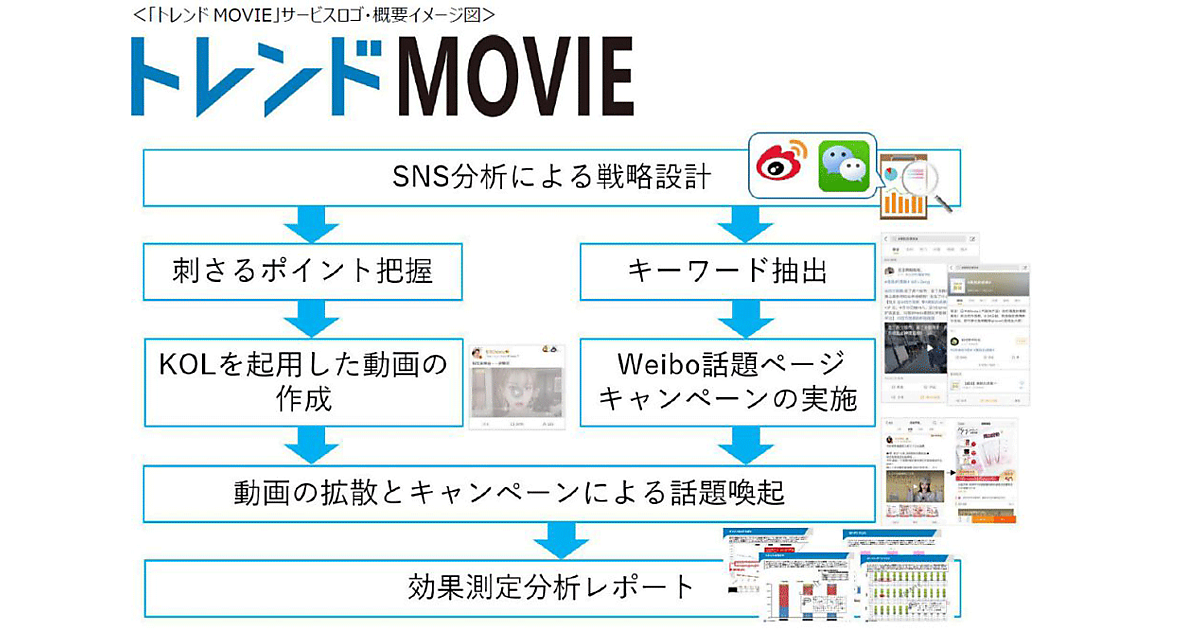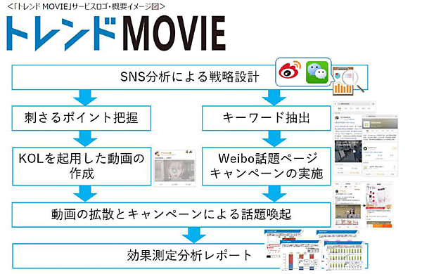 SNSデータ分析をベースに、情報波及力が高く、商品のブランドコンセプトに適したKOL(キー・オピニオン・リーダー=インフルエンサー)を起用した動画コンテンツの制作や中国のSNS「Weibo」でのキャンペーン企画などを1つのパッケージ商品にまとめ、初めて中国向けプロモーションを実施する企業にもトライアルしやすいようにした。
