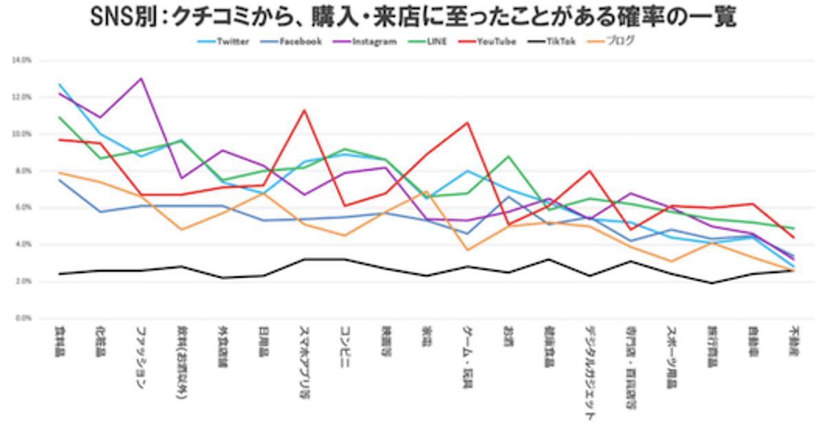 ソーシャルメディア別の購買転換率を実数値でグラフ化したものがこちら。転換率の高いSNS が、食料品であればTwitter、ファッションや化粧品はInstagram、飲料(お酒、お酒以外)はLINE、スマホアプリやゲーム・玩具ではYouTube といったように、業種ごとに異なっていることがわかる。