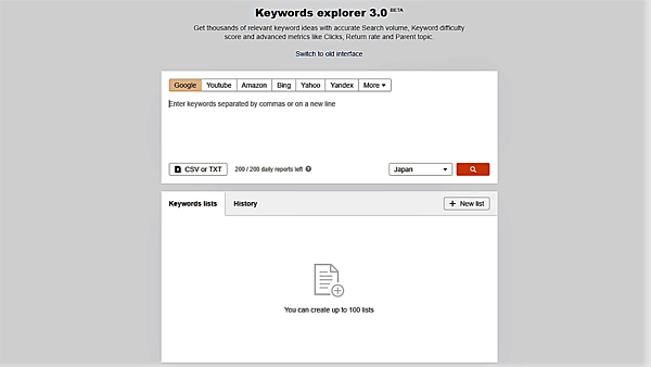 キーワード検索機能は「キーワードエクスプローラー」と呼び「3.0」になった。これまでは「Google」検索が確認できた。今回YouTube、Amazonと「Bing」「Yahoo」、ロシアの検索エンジン「Yandex」、中国の同「Baidu(百度)」、韓国の同「Daum」「Naver」、チェコの同「Seznam」のキーワード検索数調査に対応した。
