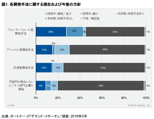 ガートナーは、「ウォーターフォール型」「アジャイル型」「反復型」のAD手法についてアンケート調査を実施。