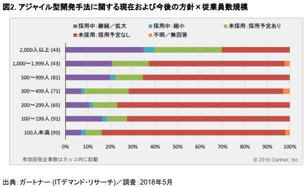 一方、アジャイル型については、従業員数2,000人以上の企業の場合、「採用中」は40%弱だが「未採用:採用予定あり」が30%と多く、関心の高さが伺える。これについてガートナーは、「環境の変化が激しいデジタル・ビジネスの時代に、WF型の手法のみでは対応が難しいという大企業の危機意識が表れている」と分析している。