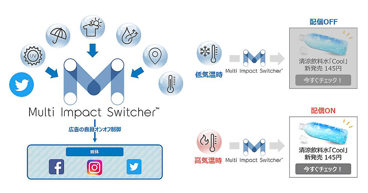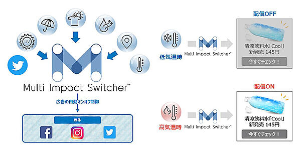 電通の100%子会社でデジタルマーケティング事業の電通デジタルは、気象情報と「Twitter」のツイート(投稿)に基づき、タイムリーな社会的な動き(ムーブメント)をデジタル広告に反映させられるシステム「Multi Impact Switcher(マルチインパクトスイッチャー)」を開発した、と2月28日発表した、同日に提供を始めた。