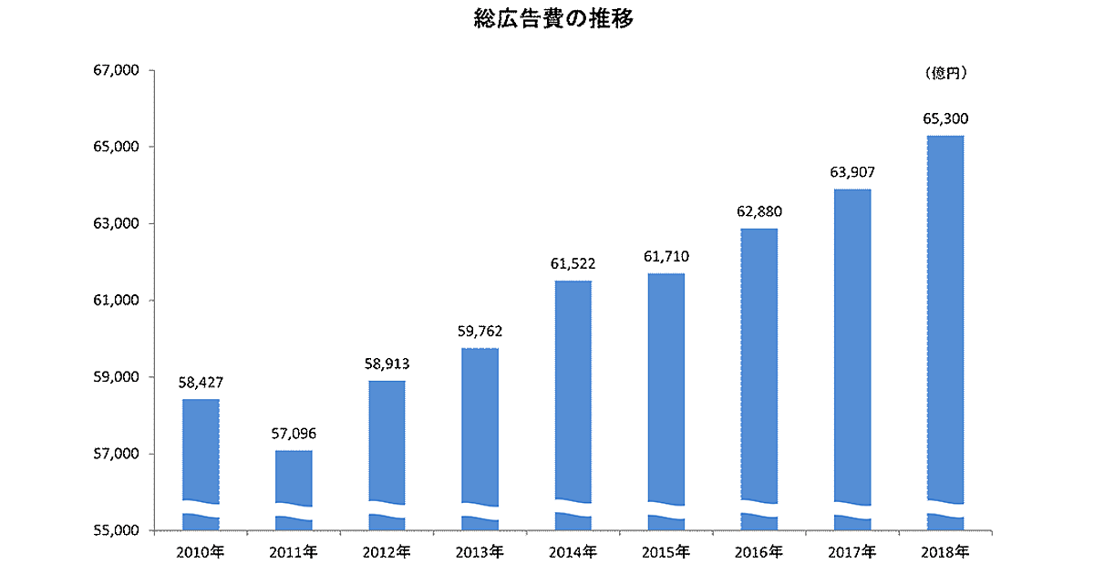 2018年(1~12月)の日本の総広告費は、戦後最長といわれる景気拡大に伴い、6兆5,300億円、前年比102.2%となり、7年連続でプラス成長となった。なお、2018年の名目国内総生産(GDP)に対する総広告費の比率は1.19%である。