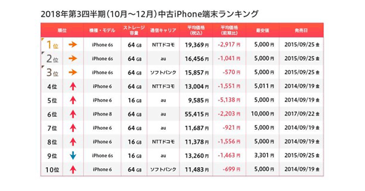 中古iPhone端末では、2014年と2015年にそれぞれ発売されたiPhone6とiPhone6sの各キャリアモデルが取引数ランキングの上位を独占した。