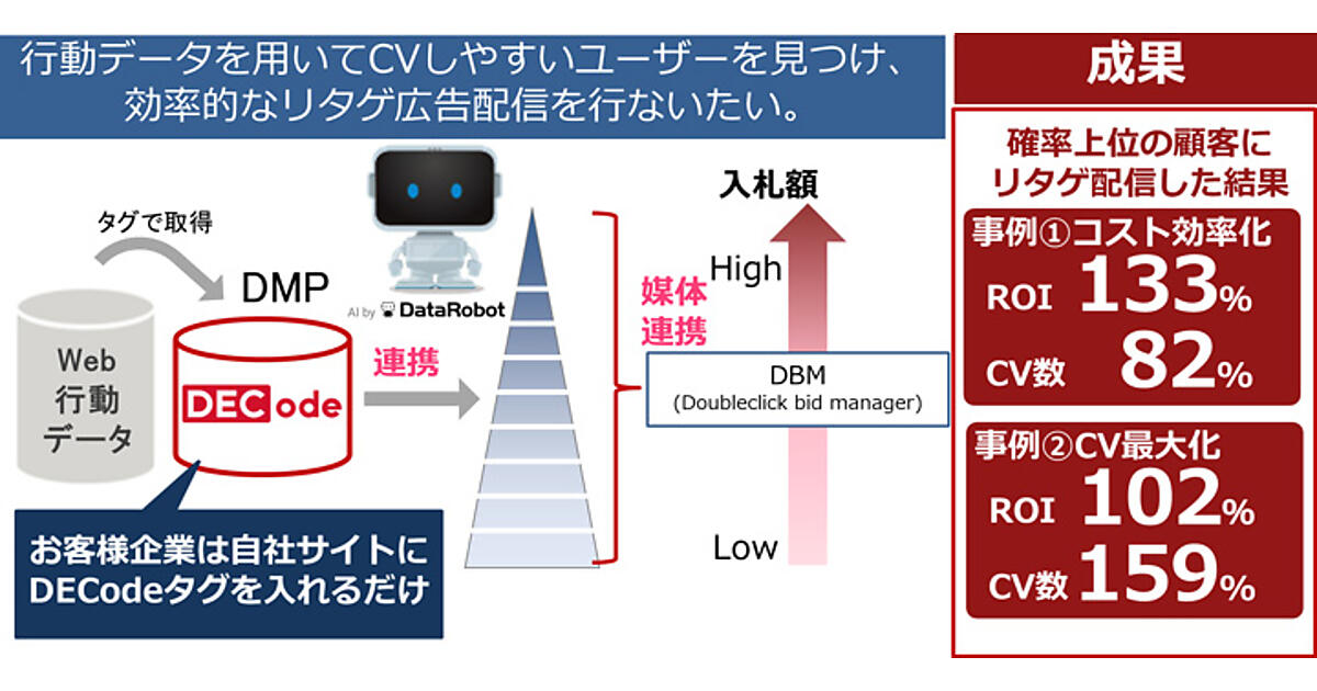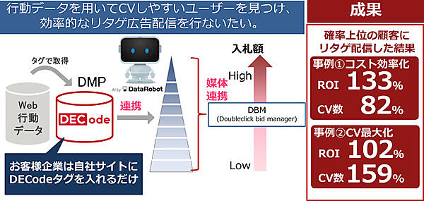 未知の顧客に対して自動的にCV予測確率を付与することで、迅速で精度の高いセグメント配信を実現。企業は自社サイトにDECodeタグを入れるだけですむ。試験導入プロジェクトでは、構築した予測モデルでセグメント配信した結果、従来の広告運用と比べてROI(投資収益率)が130%以上改善した。2019年度に20社以上への導入を目標にする。