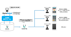 独自のDMP(データマネジメントプラットフォーム)「transcosmos decode(トランスコスモスデコード)=DECode」と、AIのDataRobotを組み合わせたデータドリブン(データ分析に基づく意志決定手法)コミュニケーションサービスの1つ。サイトのアクセスログやCRM(顧客関係管理)データをDECodeで統合し、DataRobotで予測モデルを構築する。