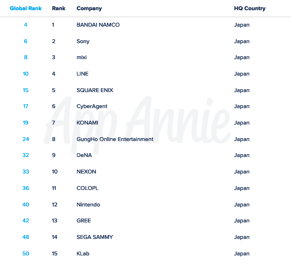 日本のパブリッシャーは、トップ10内に4社がランクイン。52位全体では15社がランクインしている。国内1位・世界ランク4位のBANDAI NAMCOは、「Dragon Ball Z Dokkan Battle」の国際的な人気で収益を伸ばした。「Fate Grand Order」がヒットしているSonyも、国内2位・世界ランク6位と好調だった。
