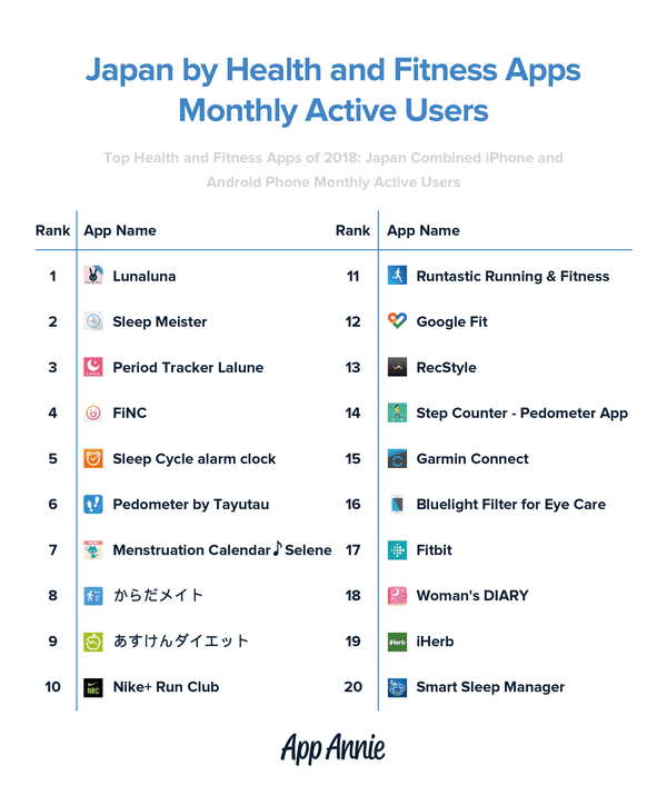 そのほかには注目カテゴリとして、ライフスタイル、エンタメ、ヘルス&フィットネスが採り上げられており、ライフスタイル(ダウンロード数)1位に「Seven-Eleven App」、エンタメ(収益額)1位に「Showroom」、ヘルス&フィットネス(月間アクティブユーザー数)1位に「Lunaluna」があがっている。