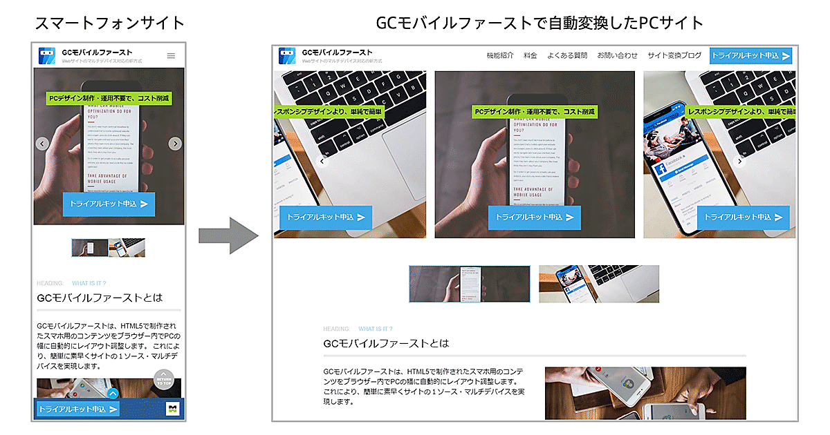 GCモバイルファーストは、サイト閲覧者の画面サイズやブラウザに応じてコンテンツを最適化するレスポンシブウェブデザインを代替するソリューション。スマートフォン用のコンテンツを2、3列にすることで、パソコン用デザイン対応する。スマートフォン用デザインの閲覧体験がパソコンでも基本的にそのまま再現できる。