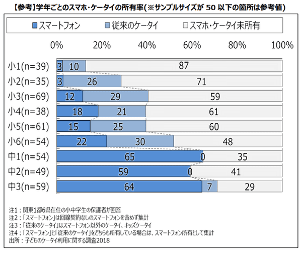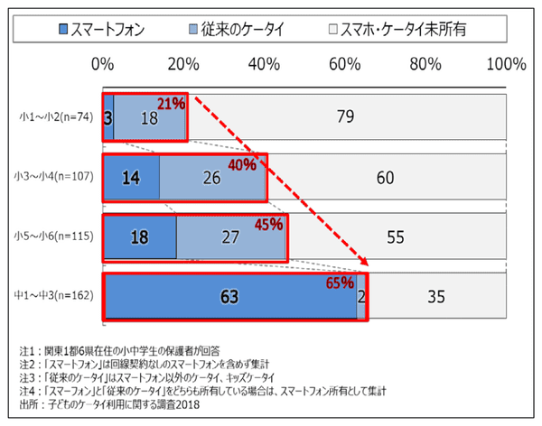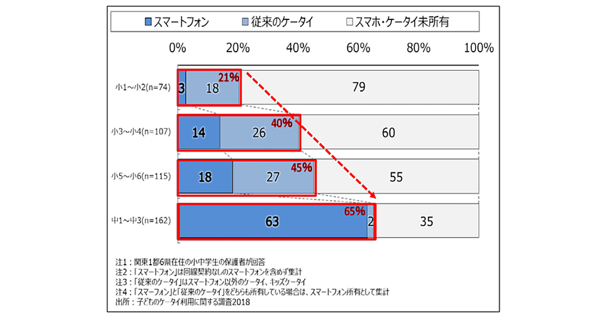 今回の調査は、子どものケータイ利用に関する調査として2018年9月に実施された。まず保護者に、子どもが持っている端末の種類について質問すると、「スマートフォン」と「従来のケータイ」の合計所有率は、小1~小2で21%、小3~小4で40%、小5~小6で45%、中1~中3で65%だった。