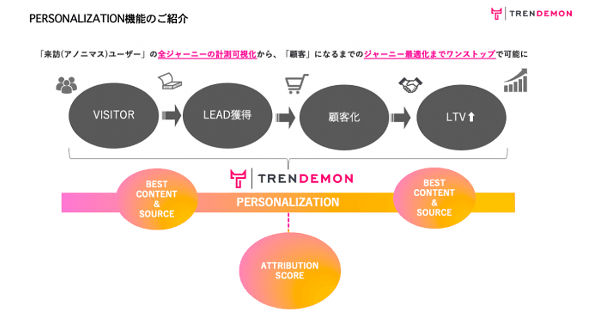 ツールのTRENDEMONは従来、日をまたいだ来訪を含むユーザーのジャーニー(購入までのプロセス)の計測結果から、流入元の広告媒体やコンテンツがコンバージョンにどのように貢献したか明らかにしてきた。これに加えてパーソナライゼーション機能によって、最も効果的なコンテンツのレコメンドまでできるようにした。