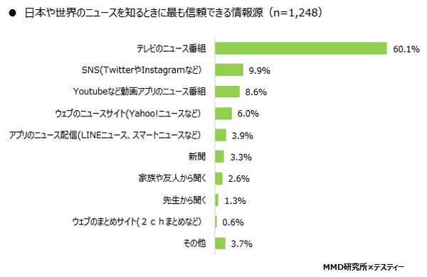次に、「日本や世界のニュースをどのように知っているのか」を聞くと、「テレビ」がもっとも多く73.8%、以下「SNS」55.8%、「ウェブのニュースサイト」38.9%の順。続いて「日本や世界のニュースを知る際に、もっとも信頼できると思う情報源」を選んでもらったところ、「テレビ」がもっとも高く60.1%。2位の「SNS」(9.9%)に大きく差を付けている。