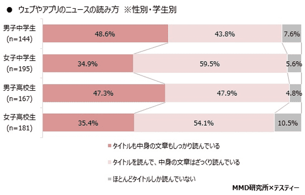 一方で、「ウェブやアプリでニュースを読む」と回答した687人に対して、「ニュースを読むときはどのように読んでいるか」を聞くと、「ほとんどタイトルしか読んでいない」という回答は7.1%にとどまり、92.9%が本文にも目を通していた。性別・学生別では、男子は「タイトルも中身の文章もしっかり読んでいる」という回答が半数近いが、女子は4割に満たず、意識差があることが明らかとなった。また関心のあるニュースジャンルにも性別で差があり、男子は「漫画・アニメ」、女子は「芸能」の注目度が高かった。「経済」「自分の住んでいる地域のニュース」などへの関心は男女とも低い。