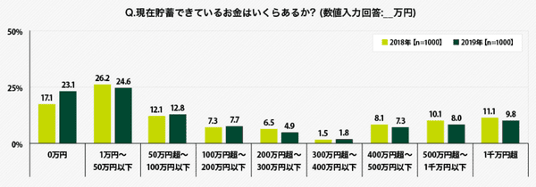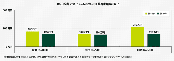 前年の調査結果と比較すると、「0万円」の割合が17.1%から23.1%と、大きく増加している。貯蓄額の調整平均(上位と下位からそれぞれ10%のデータを除外して算出)も、247万円から195万円に減少するなど、“貯蓄より消費”という30代・40代が多くなったと推察される。年代別の貯蓄額は、30代には大きな変化はみられなかった(2018年198万円→2019年194万円)のに対し、40代は120万円の減少(2018年316万円→2019年196万円)と、消費傾向が目立つ。