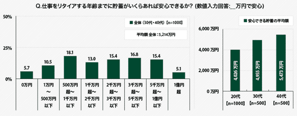 一方、「仕事をリタイアする年齢までに、どのくらいの貯蓄があれば安心だと思えるか」を聞いたところ、「500万円超~1千万円以下」18.1%、「3千万円超~5千万円以下」16.8%、「2千万円超~3千万円以下」「5千万円超~1億円以下」同率15.4%などに、回答が集まり、平均額5,214万円で大きな隔たりが伺える。