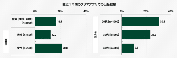 そこでまず、個人の“プチ収入源”として注目される「フリマアプリ」について質問。「直近1年間に、フリマアプリで出品したことがある」人は16.5%で、男女別では男性12.2%、女性20.8%だった。20代の調査結果(2018年10月実施)も含め、年代別で比較すると、20代30.4%、30代23.2%、40代9.8%と、若い世代の活用が目立った。