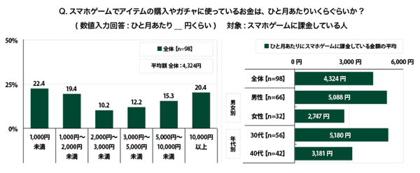 ちなみに、スマホゲームをしている人(946名)に、「スマホゲームでの課金状況(アイテム購入やガチャなど)」を聞いたところ、「課金している(有料サービスを利用している)人」は10.4%、男女別にみると、男性13.8%、女性6.8%で、大きく差がついた。ひと月あたりの課金の平均額は4,324円で、男性5,088円と、女性2,747円とこれも、男女差があった。