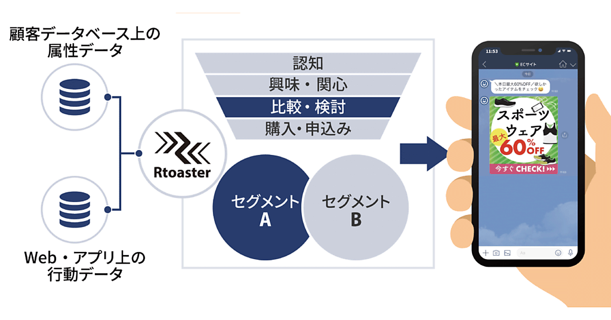 従来、企業がLINE公式アカウントからパーソナライズしたメッセージを配信するには、LINEが提供する「Messaging API」と企業内のシステムをつなぐ開発が必要だった。Rtoaster plus LINEは、「Web・アプリ上の行動データ」と「顧客データベース上の属性データ」をかけ合わせた顧客セグメンテーション機能を標準搭載している。
