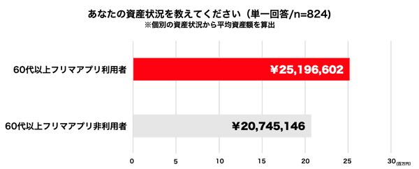まず60代以上の実態を知るため、「60歳以上・フリマアプリ利用者(412名)」「60歳以上・フリマアプリ非利用者(412名)」に、平均資産・労働意欲・今後チャレンジしたいことなどを聞いた。平均資産額を集計したところ、フリマアプリ利用者の平均資産額は約2,500万円、非利用者は約2,100万円で、利用者のほうが資産額が多かった。