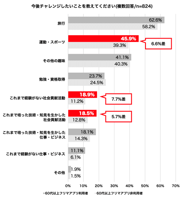 「今後チャレンジしたいことがあるか」を聞くと、フリマアプリ利用者の65.5%が「ある」とする一方で、非利用者は47.6%と半数を切っており、ここでも意識差が見られた。「今後チャレンジしたい内容」については、フリマアプリ利用者は、非利用者と比較して「これまで経験がない社会貢献活動」「運動・スポーツ」「これまで培った技術経験を生かした社会貢献活動」に意欲的だった。