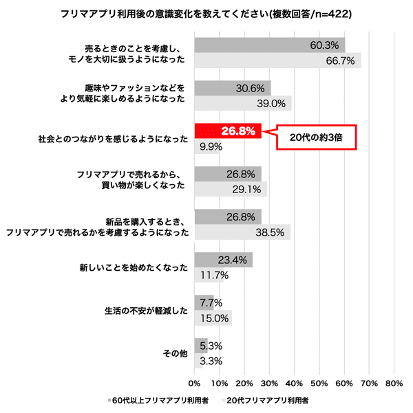 一方で、「新品を購入するとき、フリマアプリで売れるかを考慮するようになった」は、60代以上は26.8%、20代は38.5%で、20代が上回っている。「生活の不安が軽減した」も、ポイント差が大きい。60代以上はフリマアプリについて、単なる“不要品処分の場”とは捉えておらず、売買の交流といったソーシャル面に「社会とのつながり」を見出している、といえるだろう。