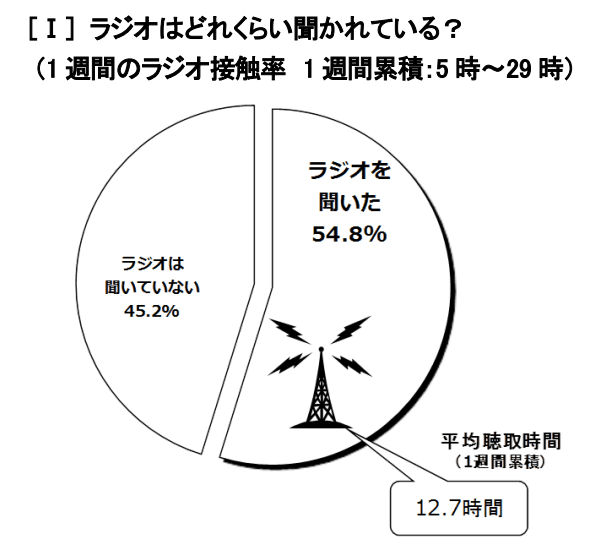 まず、聴取率(1週間のうちにラジオを聞いた人)は54.8%で、男女12~69才の過半数を占めた。リスナー(ラジオを聞いた人)の1週間累積での平均聴取時間は12.7時間と、1日あたり2時間近くラジオを聞いていた。