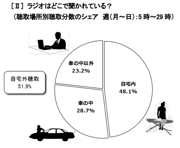 聴取場所について聞くと、「自宅内」で聞かれる割合がもっとも多く48.1%。以下「車の中」28.7%、「車の中以外」23.2%だった。ただし「車の中」と「車の中以外」の合計だと51.9%となり、「自宅内」を上回っている。