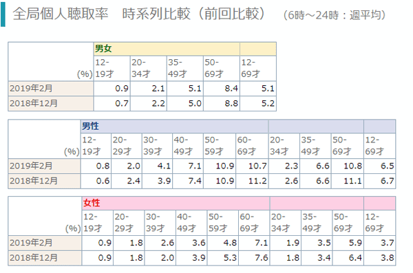 個人の聴取率について、前回調査(2018年12月)と比較すると、全体での聴取率は男性マイナス0.2ポイント、女性マイナス0.1ポイントの減少。各世代別性別で見ても大きな変動はないが、男性60~69才、女性50~59才、女性60~69才ではすべてマイナス0.5%減少しており、シルバー層において聴取率の減少傾向があるように見える。他地域や今後の動向に要注目だろう。なお、女性30~39才はプラス0.6ポイントと聴取率がもっとも増加していた。