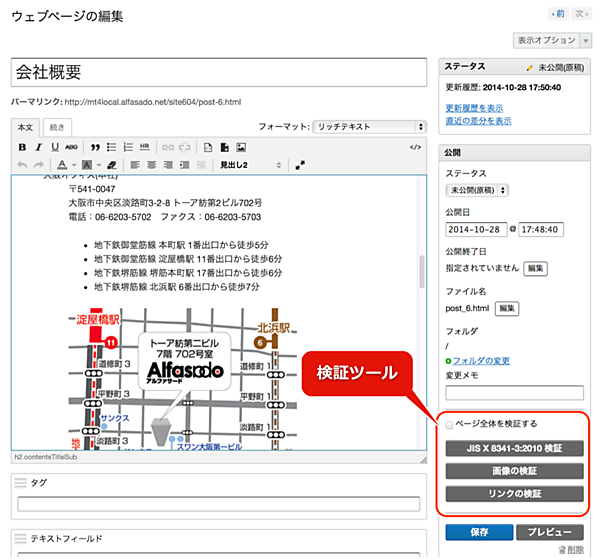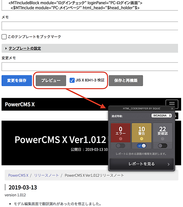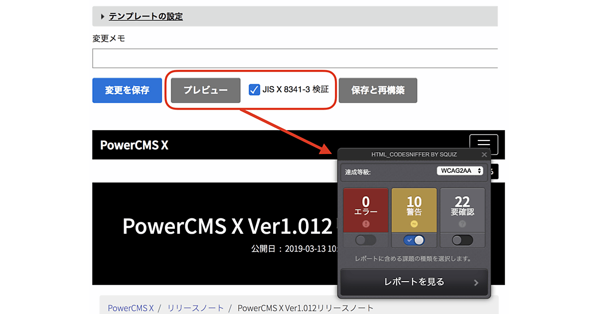 テンプレートの作成・編集画面にWebアクセシビリティ対応を支援する「JIS X 8341-3 検証」チェックボックスを追加した。プレビュー時にブラウザのレンダリング結果のWebアクセシビリティチェック結果を自動で表示する。言語設定が日本語の場合、メッセージ、結果からのリンク先などはすべて日本語で確認できる。