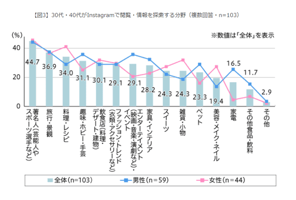 続いてInstagram利用者に、「Instagramで見たり、情報を探したりする分野」について聞くと、「著名人(芸能人やスポーツ選手など)」44.7%がトップで、以下「旅行・景観」36.9%、「料理・レシピ」34.0%、「趣味・ホビー・手芸」31.1%、「飲食店(料理・デザート・建物)」30.1%が続く。