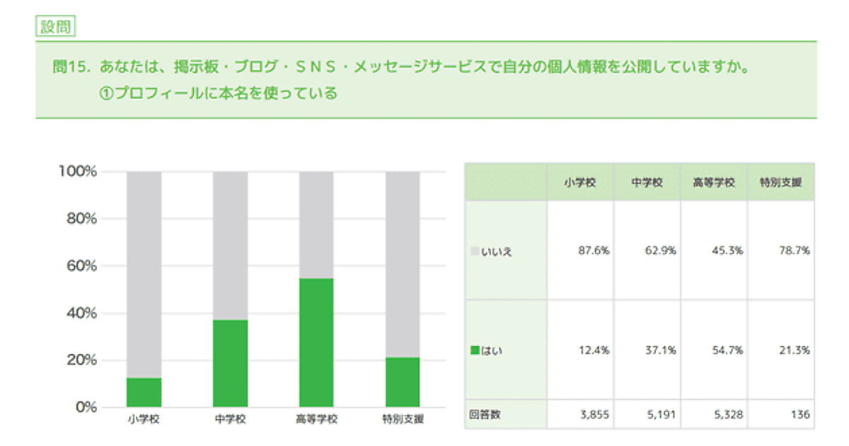 調査対象の小学生・中学生・高校生に、「SNS上でのプライバシー情報の公開状況」を聞くと、「本名を公開している」とした割合は、小学生で12.4%、中学生で37.1%だったが、高校生は54.7%と半数を超えた。「プロフィールに本名が分かるようなニックネームを使っている」も、高校生のみ53.5%で過半数だった。ただし、「メールアドレスやLINEのIDを公開している」としたのは、小中高いずれも1桁台に留まっている。