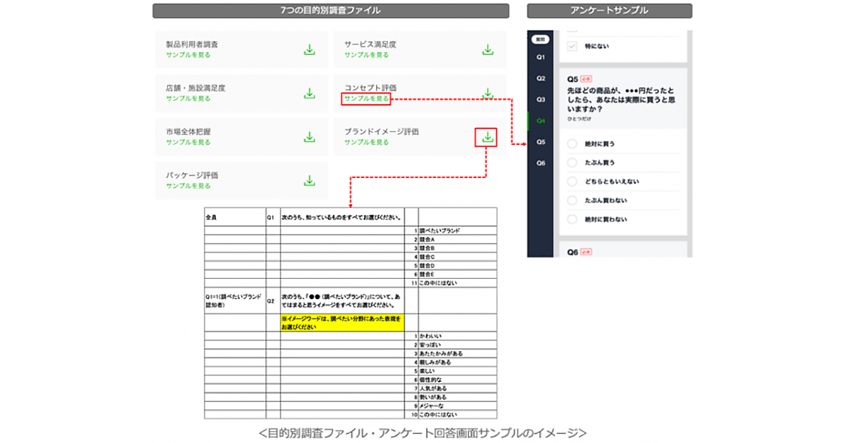 ライトコースでは、新たな機能として、調査ファイルのテンプレート「目的別調査ファイル」を提供。実用性の高い7種類(製品利用者調査、サービス満足度、店舗・施設満足度、コンセプト評価、市場全体把握、ブランドイメージ評価、パッケージ評価)のテンプレートの提供を開始した。