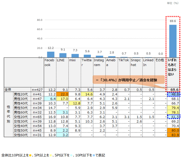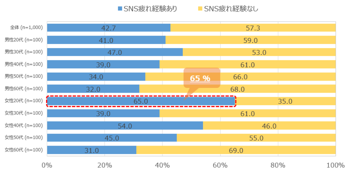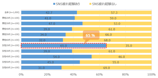 “SNS疲れ”が最も多いのは「女性20代」、男性同年代の1.5倍・男女60代の2倍に達する