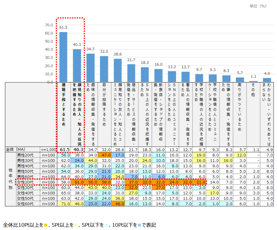 また女性20代は、「SNSの利用理由」において、全体主流の「連絡手段として」「顔見知りの友人・知人の近況を把握するため」以外に、「自分が投稿するため」「趣味の情報収集・発信をするため」「商品・サービスの情報収集・発信をするため」「SNS上の人の近況を把握するため」などが、他年代より高めの数値を示している。単なるコミュニケーション手段ではなく、自己実現・自己表現・自己承認などにもSNSをフル活用していることが、より“SNS疲れ”も加速させていると考えられる。