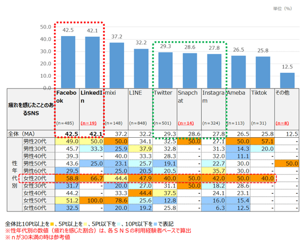 次に、利用SNSごとに“SNS疲れ”経験を聞くと、「Facebook」42.5%、「LinkedIn」42.1%と、ビジネス色の強いSNSが2トップとなった。LinkedInはサンプル数が少なく参考値だが、匿名性や娯楽性が低く、職場の人との交流が含まれるSNSほど疲れやすいと見られる。なお、20代女性は、どのツールにおいても、4割以上がSNS疲れを経験していた。