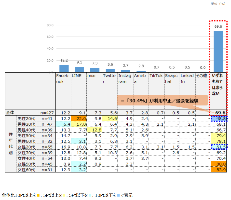 こうしたSNS疲れにより、「利用をやめた・退会した経験」を利用SNSごとに聞くと、最も多かったのは「Facebook」12.2%で、ここでは「LINE」9.1%が続いた。性別年代で見ると、男性20代では22.0%が「LINE」の利用を止めており、他より高い。