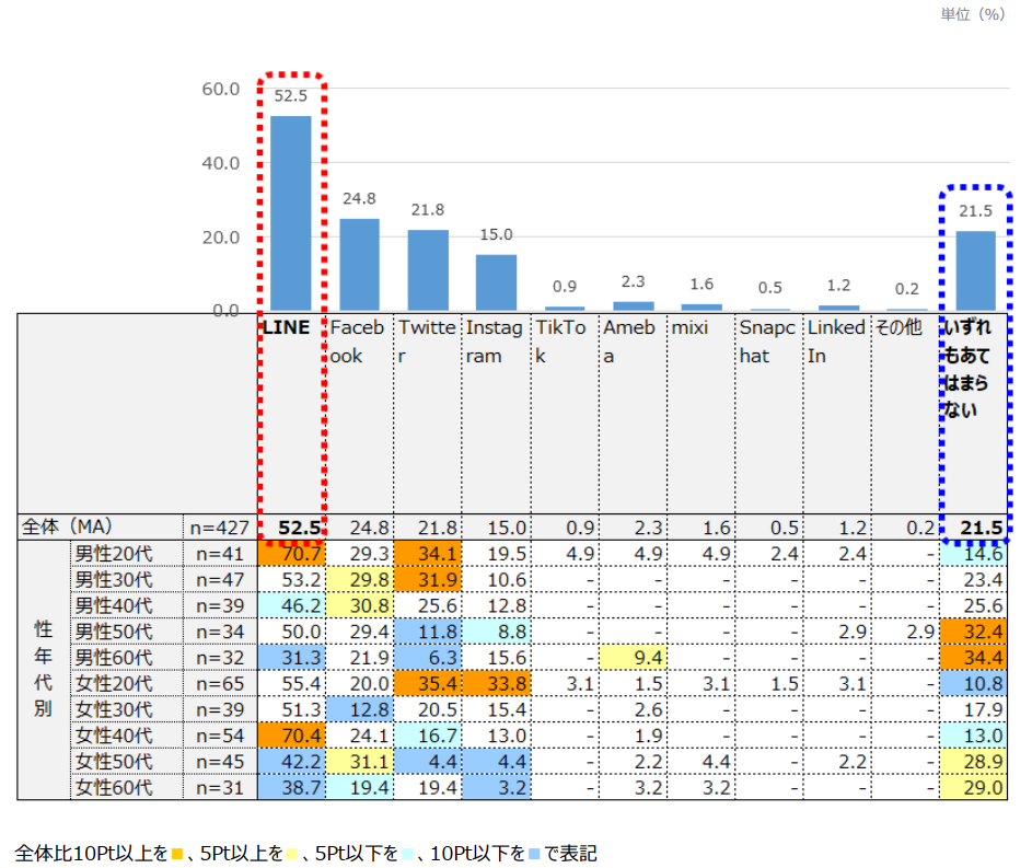 さらに、「SNS疲れを感じたことがあるが、今後も使いたいと思うSNS」を聞くと、LINEユーザーの半数以上(52.5%)が「今後も利用したい」と回答している。FacebookやInstagramのような、画像投稿を主体としたSNSに比べ、LINEはコミュニケーション手段としての利用意向が高いためと考えられる。