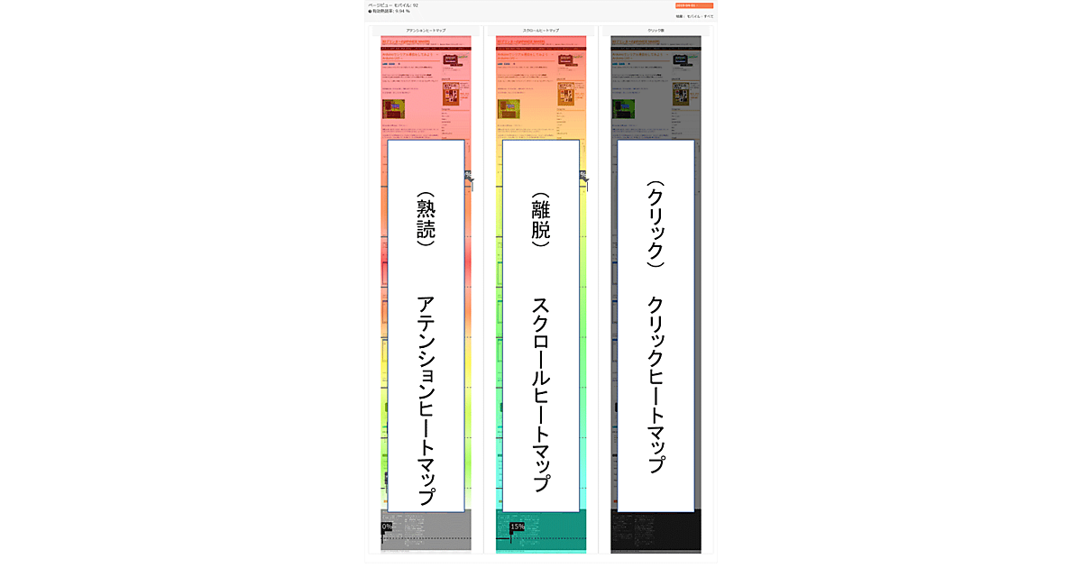ヒートマップはデータを色や濃淡で表現した可視化グラフを意味する。ミエルカヒートマップは「熟読箇所(アテンション)」「離脱箇所(スクロール)」「クリック箇所(クリック)」の解析結果を別々のヒートマップとして表示する仕組みだが、3データを1画像で同時に見ると分析が効率化するため、新オプションを導入した。