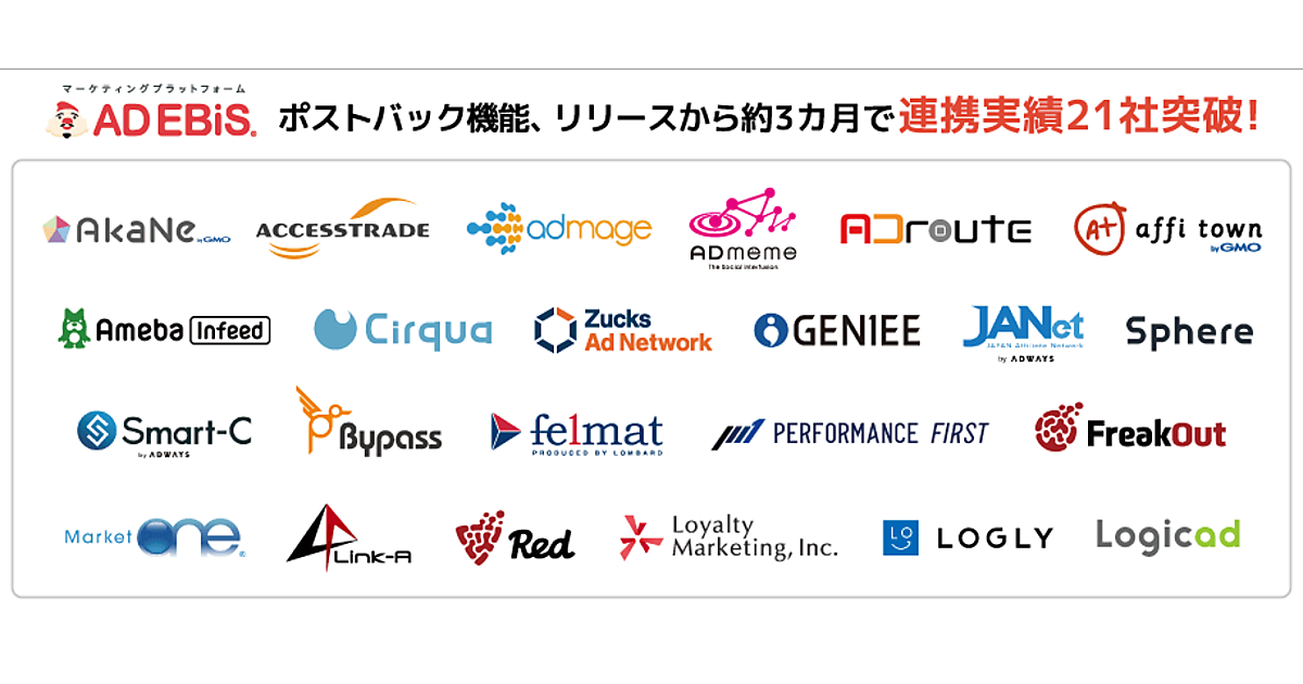 マーケティングロボット開発のロックオンは、同社のマーケティングプラットフォーム「アドエビス」が連携する広告配信プラットフォームが3月時点で21社・23サービスになった、と4月10日発表した。アドエビスで測定したコンバージョン(最終成果)データを通知する「ポストバック機能」で各社・サービスと連携している。