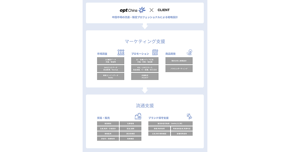 資本金1億1000万円でオプトホールディングが100%出資した。オプトホールディングと同じビルに置き、社員は12人。ブランドインキュベーション(育成)支援▽プロモーション支援▽越境ライブコマース(生放送動画による商品紹介・販売)▽市場調査・ブランド保守関連▽商品企画・製造支援--の各事業を手掛ける。
