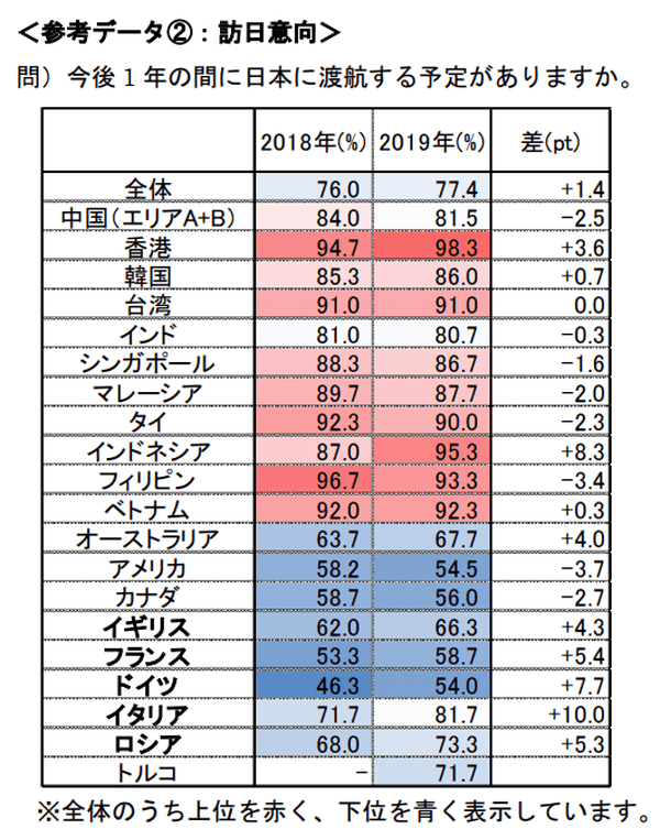 「訪日意向(今後1年の間に日本に渡航する予定があるか?)」は、昨年の76.0%から77.4%と微増し高い水準を維持。もっともスコアが高いのは「香港」で、以下インドネシア、フィリピン、ベトナムなどアジア諸国が続く。欧米諸国は数値自体は低いが、イギリスが前年比4.3pt増、フランスが5.4pt増、ドイツが7.7pt増、イタリアが10.0pt増、ロシアが5.3pt増と、大きく伸長している。
