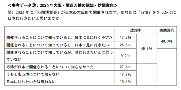 2025年に開催される「大阪・関西万博」については、「日本に見に行く予定」13.7%、「日本に見に行きたい」26.6%と、計40.3%が訪問意向を示した。