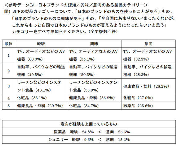 最後に、ジャパンブランドの製品について、「経験(使ったことがある日本ブランドの製品)」「興味(興味がある日本ブランドの製品)」「意向(今自国にあまりない/まったくないが、これからもっと自国で買えるようになったらいいと思う日本ブランドの製品)」を聞いた。