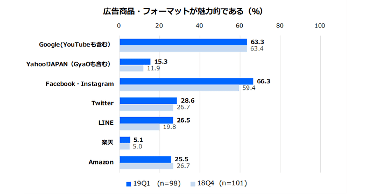 次に「広告フォーマットが魅力的な広告プラットフォーム」を聞くと、「Facebook」66.3%が前回1位のGoogleを上回りトップとなった。18Q4調査と19Q1調査の比較では、Facebookのほか、Yahoo! JAPANとLINEの伸長が目立つ。