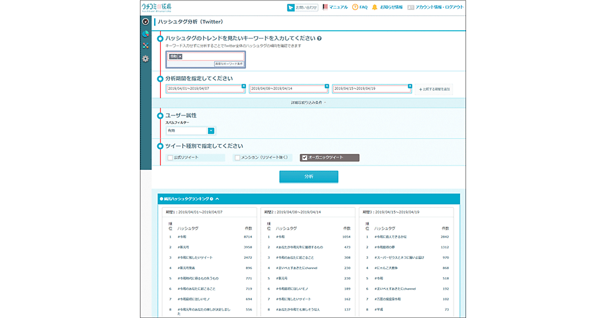 分析機能を使うと、多くのユーザーにリーチできる有効性の高いハッシュタグワードが分かる。Twitter上で特定の集団が普段利用しているハッシュタグが把握でき、キャンペーンに生かせる。検索期間は最長1週間で同時に最大4期間が比較可能。利用にはオプション「Twitter(過去10%サンプリング型)」の申し込みが必要。