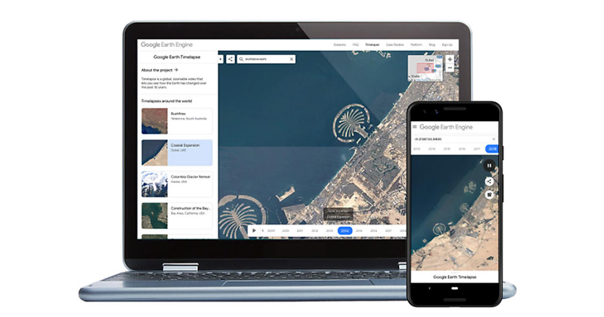 タイムラプスはGoogle Earthのエンジンを使い、USGS(米国地質調査所)/NASA(米国航空宇宙局)のランドサットプログラムなどの衛星画像によって雲がない画像を表示。エンジンには日本のJAXA(宇宙航空研究開発機構)のデータセットも提供を始め、豪雨による土砂崩れを広範囲で検知することに使われている。
