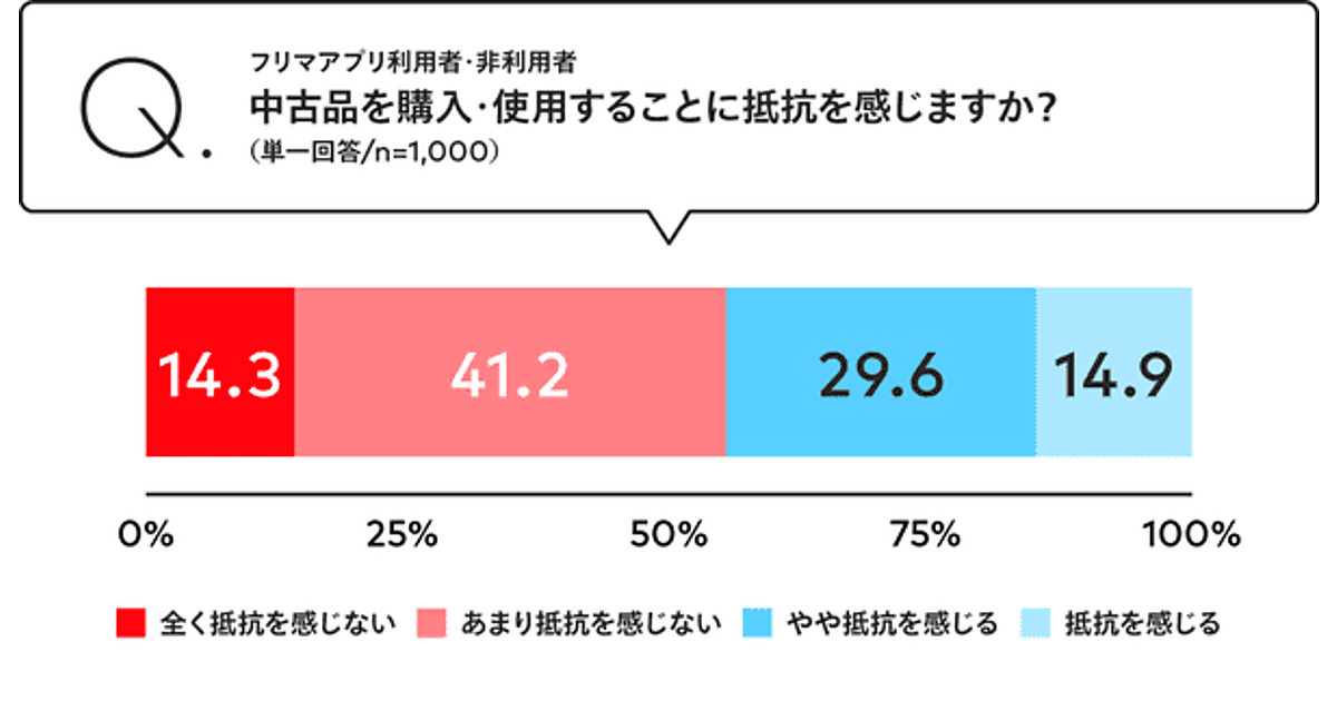まず、フリマアプリ利用者・非利用者両方に「中古品の購入・使用に対する抵抗感」を聞くと、全体では「抵抗を感じない」55.5%が「抵抗を感じる」44.5%を上回った。アプリ非利用者に限ると、「抵抗を感じる」55.6%のほうが過半数だが、前年(61.8%)と比較すると、6.2%減少している。アプリ利用者においては「抵抗を感じる」33.4%だ、これも前年(35.5%)と比較し2.1%減少していた。