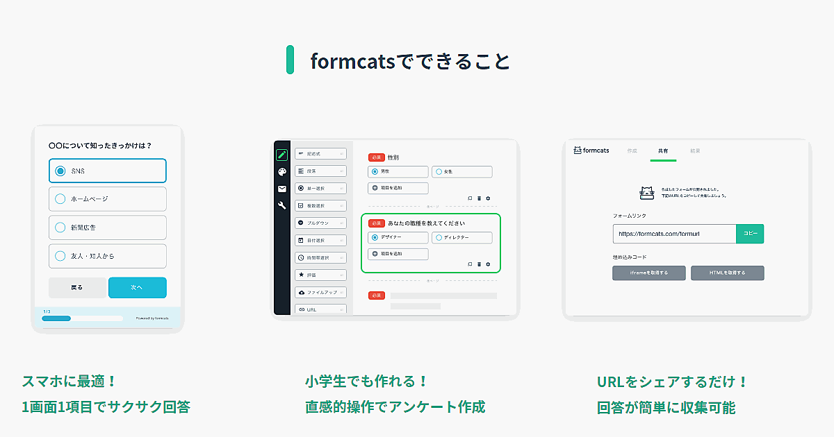 オンラインショップ運営支援事業のエフカフェは、簡単に回答できるアンケートフォーム「formcats(フォームキャッツ)」のサービスを5月15日に始めた、と同日発表した。1画面1項目で“サクサク”回答できることが特長で、スマートフォンに適している。離脱が多いとされる従来のアンケートフォームの課題を解決する。